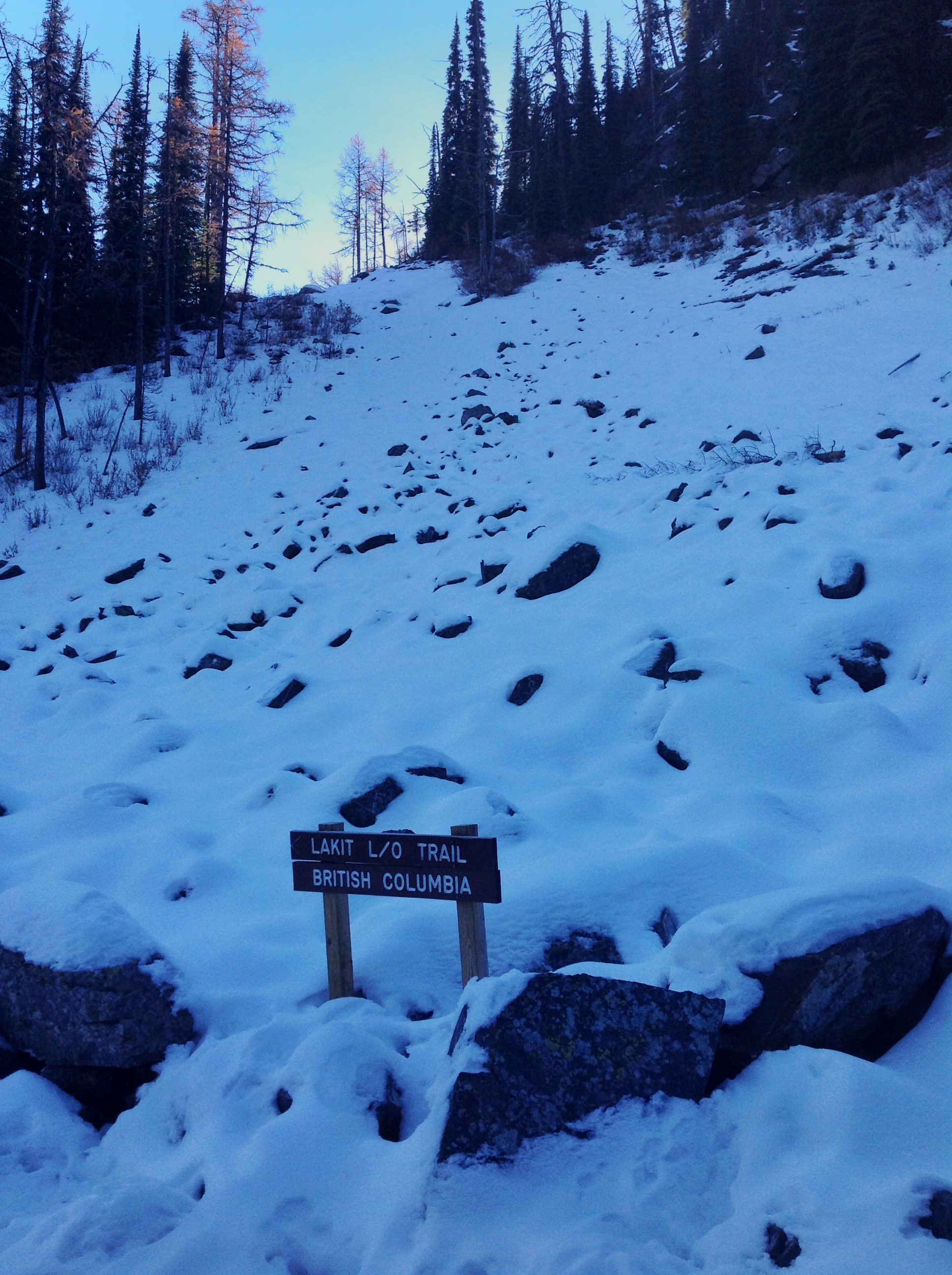 By Saturday this layer of cloud still held Cranbrook prisoner. It was the mission of the hiking club to go in search of the elusive sun. There were four determined hikers who left a gloomy, dismal city in search of sun and blue sky. The destination was Lakit Lookout. In addition to blue sky and sun, there would be the last of the spectacular color of the Western and Alpine larch. The low cloud cover still hugged the valley bottom on the hour drive to the trail head climbing up the Wildhorse Road heading into the Rocky Mountain trench.