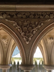 My fascination was with the doors of all shapes and sizes, the markings on the individual doors and the hardware. The cloister was lovely with the intricate detailing at the top of the moldings, each one a different leaf or flower. Thank goodness the way was marked as there were many twists and turns and ups and downs. The view of the surrounding area was grand. You could see the area of France across the channel and in the distance sheep grazing.
