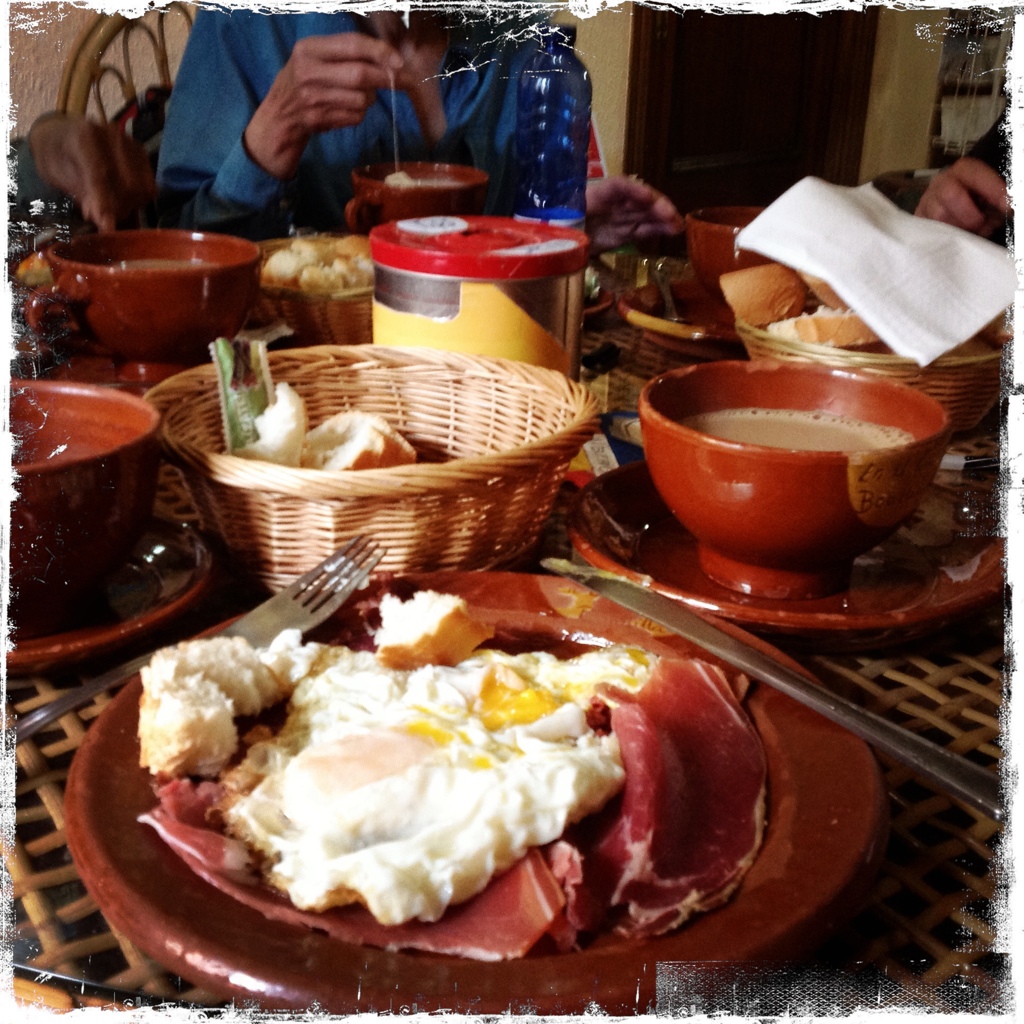 It took another hour and fifteen minutes before we reached the village of Boadilla del Camino. This is where we had wanted to stay but it was full so we needed to head for Fromista a much bigger city. We needed a cafe con leche in the worst way. As we passed the Albergue En El Camino, they were offering breakfast. This was the best breakfast I have had so far on the El Camino. Eduardo provided a huge plate of eggs with ham and a humongous cup of coffee. Totally awesome!