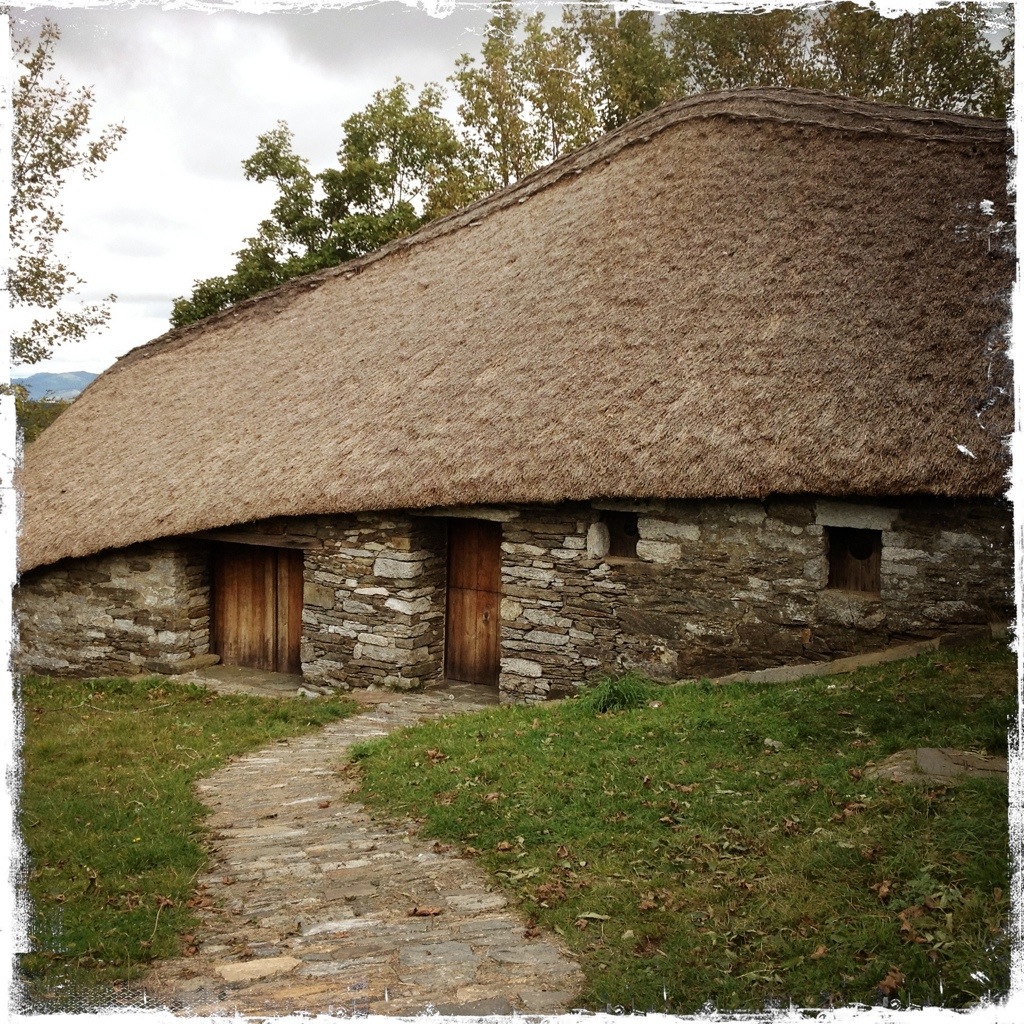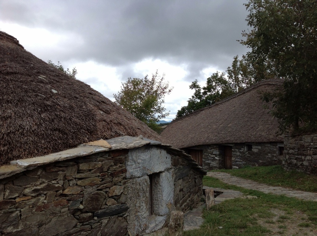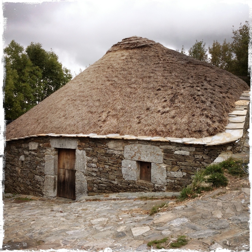 O’Cebreiro is in the top twenty of the places to see in Spain. The hamlet’s round, thatch-roofed pallozas are a distinctive form of rural architecture once found across Celtic lands from Africa to Scotland. Their round walls and conical thatched roofs aerodynamically deflect the strong mountain winds. Chimneys would interfere with the tight weather defences, so smoke escapes through the thatch itself curing the sausages and hams that hang from the ceiling as the smoke escapes.