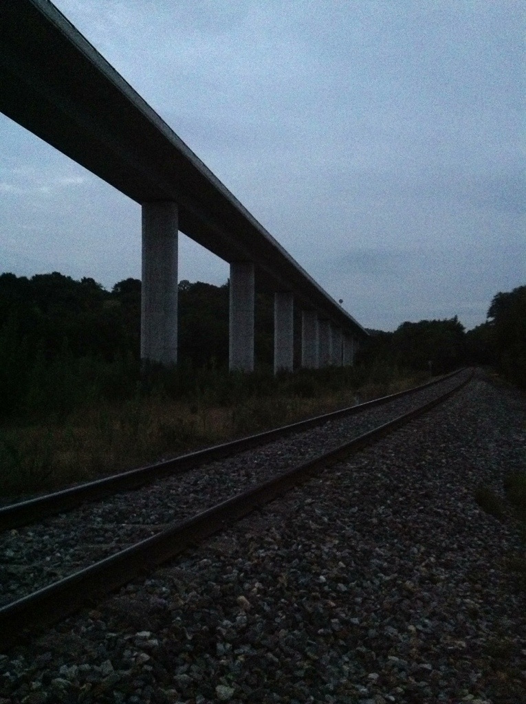 It was a mild but cloudy day with rain that threatened but did not materialize. I passed under bridges and over train tracks in the early morning.