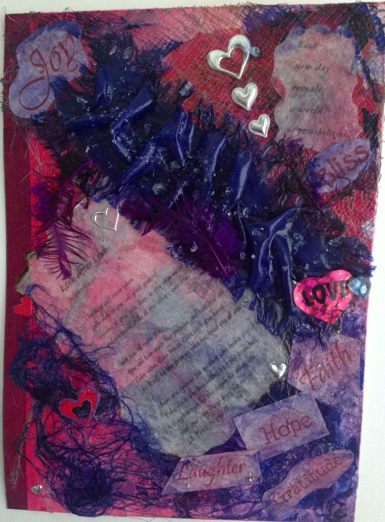 My first mixed media, right brain creation has finally been completed. It is hard slipping into the right brain frame of mind. But…once engrossed in the project, it is easy for the hours to slip by as I have fun and play creatively.