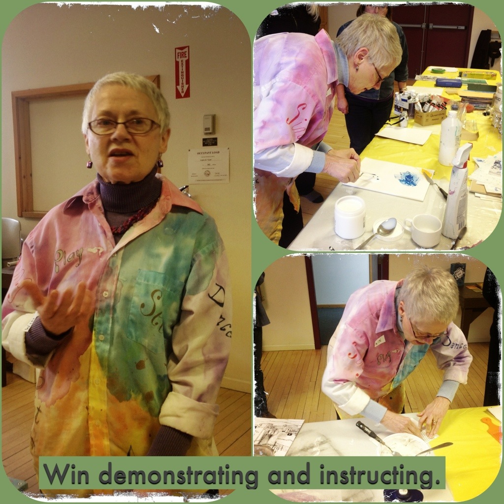 The workshop was taught by Win Dinn a talented mixed media artist from Creston, BC. Win is an excellent instructor. She demonstrates the various techniques used in mixed media and challenges you to have fun and playfully create. Win knows her craft and is very adept in the use of color theory. She encourages you step outside of your comfort zone and adapt the techniques of mixed media and create your own style.