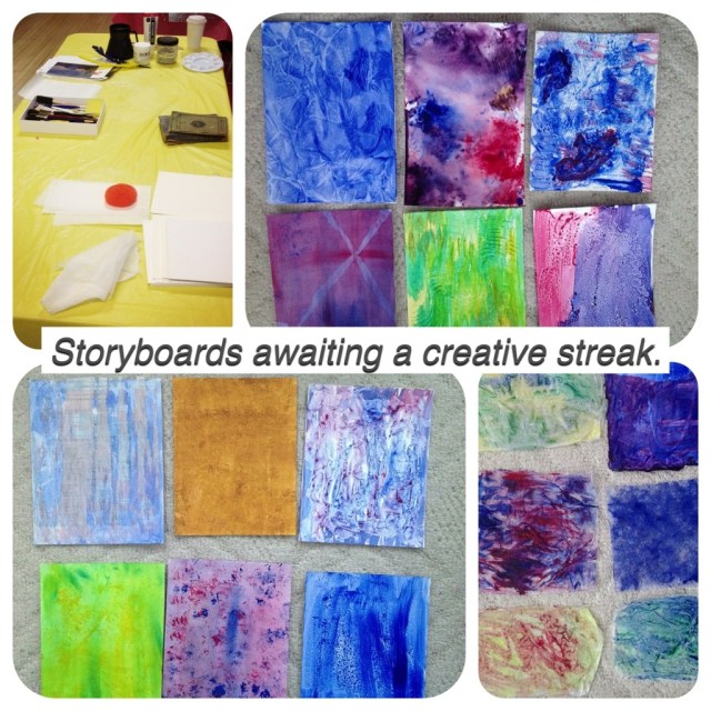 Over the two days, Win demonstrated eighteen different mixed media techniques one could use to create a storyboard. Using artist tissue paper, I learned to make crystalline paper, brayer paper and using wet tissue paper to create definition and/or designs on my storyboard. Win illustrated a variety of techniques from using drywall compound, plastic wrap, alcohol, sponges, rags, paper towels, sanding and frog tape to create various designs and dimensions on a storyboard. I learned how to use paraffin wax, warm oil pastels, wax crayon and Vaseline to create resists in my art creations.