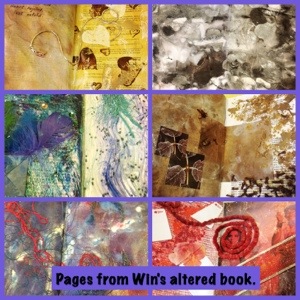 Each workshop participant was given a recycled book from the Creston library and Win encouraged us to use mixed media to make the pages into an altered book.