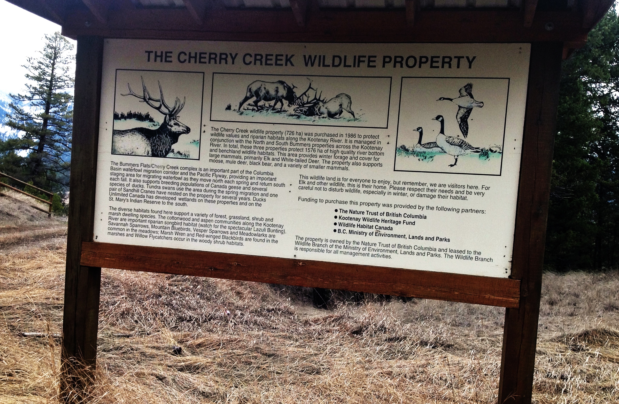 It takes about half an hour drive from Kimberley to reach the Cherry Creek Wildlife Property. This is an area of 968.82 hectares striving to preserve the Pacific lowlands, wildlife habitat and waterfowl migration corridor along the Kootenay River. This area neighbors the St. Mary’s Indian Band reserve and several ranches.